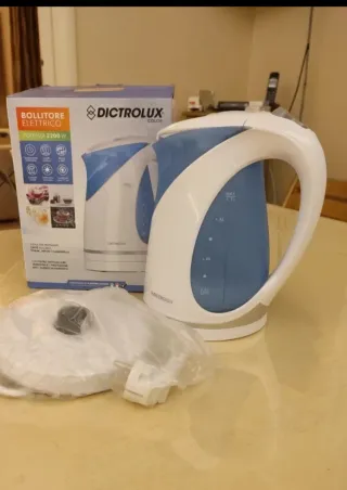 Bollitore elettrico Dictrolux di colore bianco e blu. - Potenza 2200 W. - Capacità massima 1.7L. - Indicatore livello acqua. - Filtro anticalcare rimovibile. - Protezione surriscaldamento.