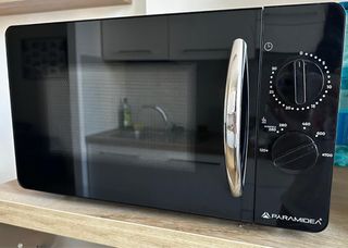 Microonde Pyramidea di colore nero, in ottime condizioni. Design moderno e compatto. Maniglia cromata lucida. Pannello comandi intuitivo.