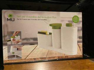 Set di 3 pezzi per organizzare il lavandino. - Contenitore per sapone facile da premere. - Flacone di detersivo spremibile. - Design compatto per risparmio di spazio. - Spazzola e spugna non inclusi.