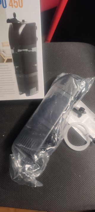 Filtro interno per acquari. - Modello FILPO 450. Internal filter for small to medium sized aquariums, terrariums and turtles Maximum water flow rate 450 lt/h - 6.0 watts Equipped with sponge for mechanical and biological filtration and cartridge with activated carbon for chemical filtration Quick and easy installation. No other fitting, hose or appliance required. Compact but with large internal volume, ideal for aquariums from 20 to 60 litres - Colore nero e trasparente.