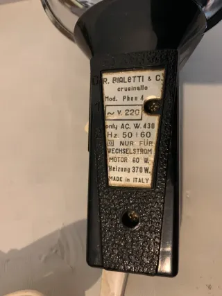 Phon Bialetti vintage, un classico del design italiano. - Modello Phon 4. - Alimentazione: 220V AC, 50/60 Hz. - Potenza motore: 60W. - Potenza riscaldamento: 270W. - Made in Italy.