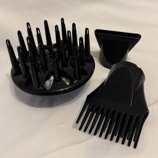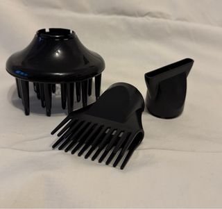 Set di accessori per asciugacapelli. - Diffusore nero. - Beccuccio concentratore nero. - Pettine nero per styling.