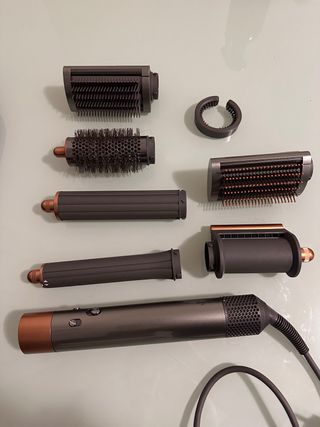 Set di accessori per Dyson Airwrap. Include accessori venduti separatamente del valore di 50€ ciascuno... - Corpo principale del phon e modellatore. - Vari accessori per diversi stili di acconciatura. - Spazzola volumizzante. - Spazzola lisciante. - Cilindri per ricci in entrambe le direzioni. - Accessorio di asciugatura preliminare. - Pettine. - Base di ricarica. - Custodia di stoccaggio. L'ho comprato a settembre dell'anno scorso e l'ho usato 2 volte