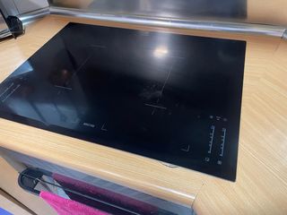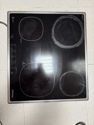 Piani di cottura a induzione Teka con tre zone di cottura. Controlli touch intuitivi. Presenta una crepa, ma funziona correttamente.