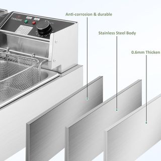 Friggitrice professionale in acciaio inossidabile con doppia vasca. - Capacità totale 12 litri. - Potenza 3400W. - Dimensioni friggitrice: 55 x 43 x 31 cm (L x P x A). - Dimensioni cestello: 21 x 24.5 x 10 cm (L x P x A). - Dimensioni vaschetta interna: 29.5 x 14.5 x 15 cm (L x P x A).