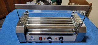 Culci wurstel professionale 5 rulli RCHG-5E marca Royal Catering. - Struttura in acciaio inossidabile. - Rulli rotanti per una cottura uniforme. - Pannello di controllo con interruttore di accensione e termostati. - Vetro protettivo anteriore. La resistenza da 1 kW di potenza consente di scaldare velocemente i rulli ad alte temperature. Una volta raggiunta la temperatura desiderata, i termostati del cuoci wurstel a rulli RCHG-5E garantiscono in automatico il mantenimento costante della temperatura. dotata anche di un cassetto per la raccolta dei residui grassi e di una copertura anti-schizzo