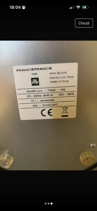 Macchina da caffè Francis Francis modello X7.1 Iperespresso. - Design Style by Luca Trazzi. - Alimentazione 220-240Vac 50/60 Hz. - Potenza 1200-1380W. - Prodotta in Cina.