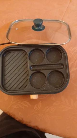 Piastra elettrica con piastra grill e piastre per pancake/uova. - Piastra grill con scanalature. - Piastre rotonde per pancake o uova. - Coperchio in vetro con manico.