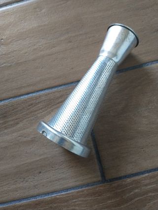 Questo filtro passapomodoro è realizzato in metallo lucido. - Design conico perforato. - Base stabile e piatta. - Finitura metallica.