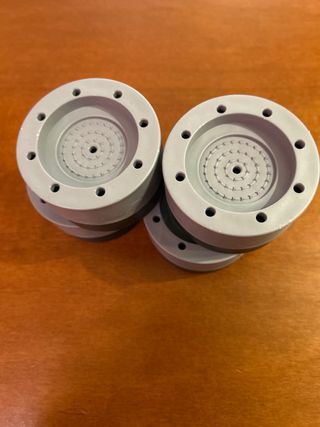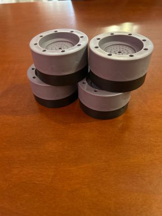 Set di quattro piedini universali per elettrodomestici. - Materiale: Gomma e plastica. - Colore: Grigio e nero. - Design cilindrico con base antiscivolo.