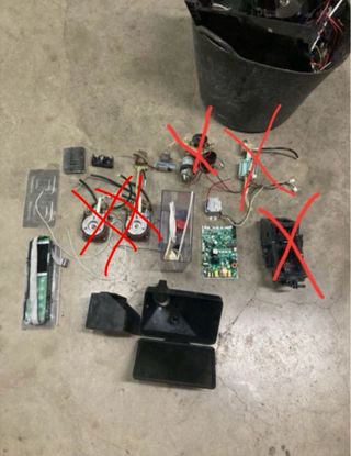 Vari pezzi di caffettiera nera Cecotec Power Matic 7000, pompa, elettrovalvole, serbatoio d'acqua, scheda elettronica, piastra tastiera, scaldabagni, trasformatore 24 V, tramoggia in plastica, ecc. Cosa vedi nella foto. Robot da caffè 25 euro, macinino da 10 euro, macinino da 10 euro, piastra 20 euro..., chiedi i prezzi. Ho venduto un processore da caffè (foto 4), il macinino da caffè e la pompa dell'acqua sono contrassegnati in rosso nella seconda foto.
