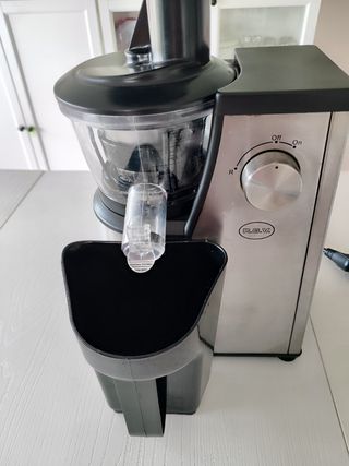 Estrattore di succo a freddo Kooper Vitabella Plus, ideale per preparare succhi freschi. - Design moderno con finiture in acciaio e nero. - Ampio contenitore per la polpa. - Tubo di alimentazione capiente.