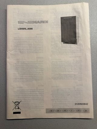 Manuale di istruzioni originale per lavastoviglie Nardi. - Modello: LSI45HL.A000 - Lingue presenti: Italiano, Inglese, Tedesco, Francese, Spagnolo, Portoghese, Olandese, Sloveno, Greco, Danese, Norvegese, Finlandese, Svedese. - Simbolo smaltimento RAEE.