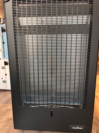 Stufa a gas con tecnologia a fiamma blu, marca Nevercold. Progettata per fornire calore in modo efficiente. La fornisco con una bombola vuota. Colore nero. Ruote per facilitare lo spostamento. Griglia frontale di protezione.