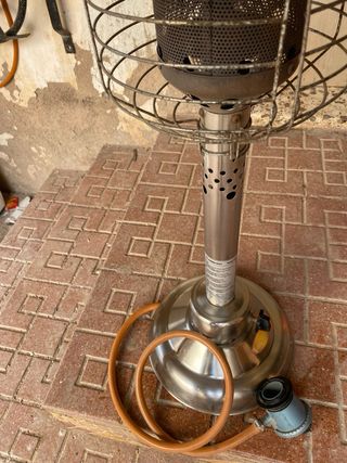 Stufa a gas per esterni, ideale per patii o terrazze. Presenta una base stabile e un design moderno. Materiale: Acciaio inossidabile. Tubo del gas incluso. Regolatore del gas.