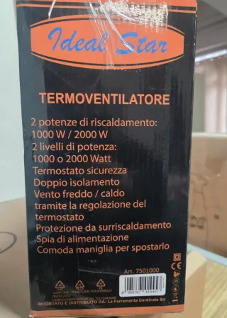Termoventilatore marca Ideal Star, ideale per riscaldare ambienti. - Potenza 2000W. - Design compatto e moderno. - Colore bianco.