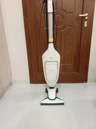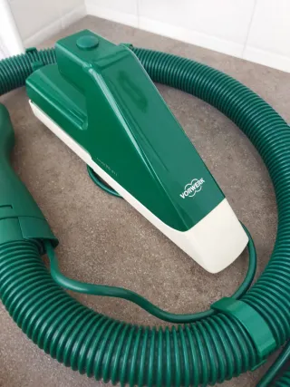 Scopa elettrica Folletto modello VK 121, un classico per la pulizia della casa. - Colore verde e beige. - Cavo di alimentazione integrato. - Spazzola per pavimenti.