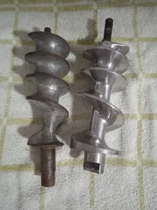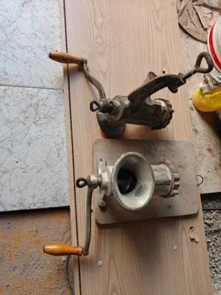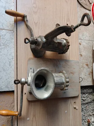 Vengono venduti due tritacarne manuali, ideali per cucinare. - Realizzato in metallo. - Includono una maniglia per il funzionamento. - Design classico e robusto.