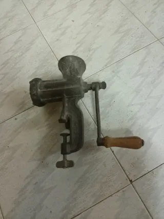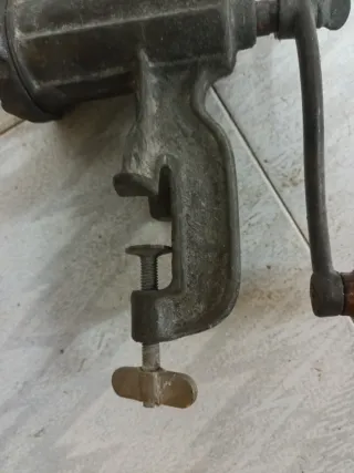 Tritacarne manuale in metallo, risalente agli anni '60. Un pezzo d'epoca per la tua cucina. - Struttura in metallo. - Manovella in legno. - Morsetto per fissaggio a tavolo.