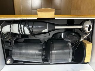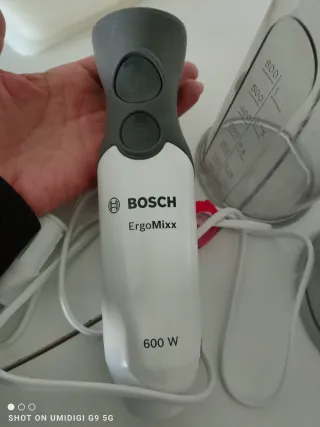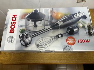 Frullatore manuale del marchio Bosch, modello Powermaxx. - Potenza di 750W. - Include accessori come fruste e tritacarne. - Design ergonomico.