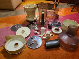Robot da cucina Moulinex con un set di accessori. Include frullatore, impastatrice e tritacarne. Include vari dischi e contenitori. Parti in plastica e metallo.
