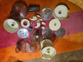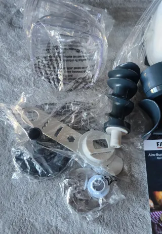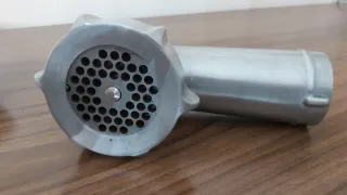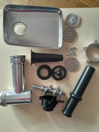 Set di ricambi per tritacarne. - Vassoio di alimentazione - Tubo di uscita - Lama in acciaio - Lame di taglio di diverse dimensioni - Imbuto per salsicce. Solo le parti mostrate nelle foto