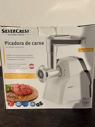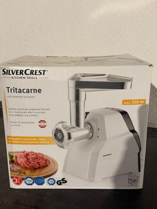 Tritacarne SilverCrest con accessori. - Potenza massima di 350 W. - Include inserto per preparare biscotti con 4 motivi. - Ideale per tritare carne e fare salsicce. - Tempo di lavoro: 15 minuti.