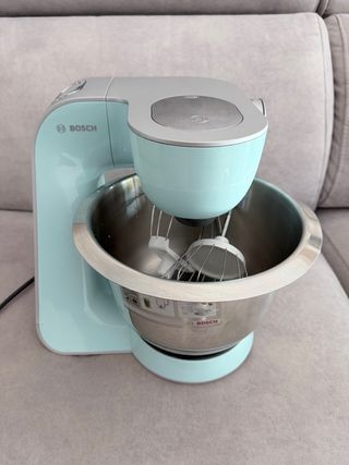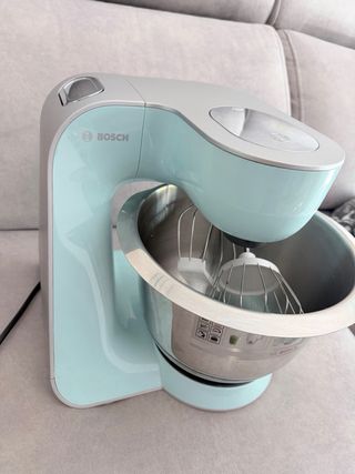 Impastatrice Bosch in colore blu e grigio. Include un contenitore in acciaio inossidabile. Inoltre, dispone di un frullatore e un tritacarne, accessori extra. Utilizzo minimo, come nuova. Design moderno. Contenitore in acciaio inossidabile.