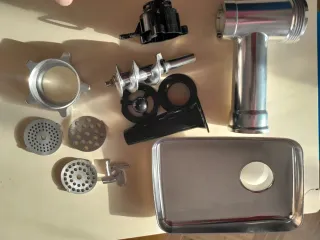 Set di accessori per tritacarne Kenwood. Usato solo 3 volte. Include: corpo del tritacarne, vite senza fine, anello di fissaggio, lama, due dischi di taglio.