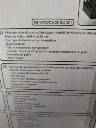 Accessorio tritacarne per robot da cucina Kenwood Chef e Major. - Modello MGX400. - Permette di tritare carne e altri alimenti. - Include contenitore e lame.