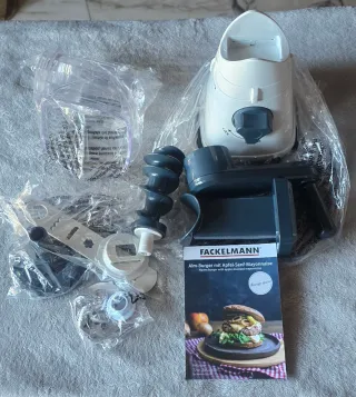 Tritacarne e insaccatrice FACKELMANN easyprep. Include tutti gli accessori. Corpo principale bianco. Componenti di taglio in grigio. Include manuale di istruzioni.