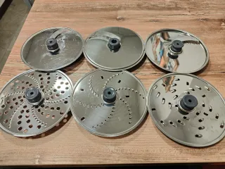 Set di accessori per il tritacarne del robot Cooking Chef, della marca Kenwood. Include vari dischi di taglio e sminuzzamento. Fabbricati in acciaio inossidabile. Centro in plastica nera.