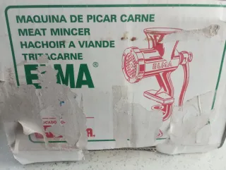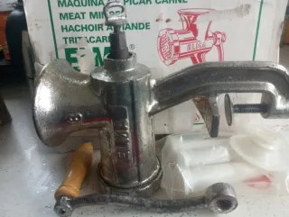 Tritacarne manuale della marca Elma, ideale per preparare i propri insaccati e tritare carne in casa. Realizzato in metallo resistente. Include manovella in legno, base con vite per fissaggio al tavolo, modello numero 8.