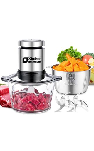 Tritacarne in acciaio inossidabile con due contenitori. - Contenitore in vetro per carne. - Contenitore in acciaio inossidabile per verdure. - Lame in acciaio inossidabile.