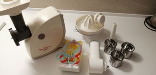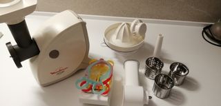 Offro tritacarne Moulinex modello HV4 ME 411 colore bianco potenza 1200W completo degli accessori per tritacarne con lama auto affilante con 2 griglie con fori di 4,7 mm e 7,5 mm, spremiagrumi, accessorio per hamburger in tre differenti formati (steak Moulding system) , accessorio per polpette, accessorio per salcicce, rullo taglia verdure a fette , rullo per grattugiato spesso e rullo per grattugiato fine. Alloggiamento intelligente per alcuni accessori. Praticamente tutto nuovo in quanto è stato utilizzato solo 2 volte il tritacarne. Nella vendita è compreso il manuale istruzioni. Non disponibile confezione originale.