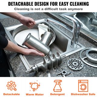 Qualità Superiore: realizzato in acciaio inossidabile alimentare, resistente all'usura e alla ruggine, compreso l'involucro esterno, il vassoio superiore e le lame. Il tritacarne commerciale ti offre un'esperienza affidabile con i suoi ingranaggi in grado di tagliare la carne di vari tipi. La superficie lucida e la lavorazione fine lo rendono bello in apparenza. Prestazione Potente: dotato di un motore da 850W, il tritacarne può raggiungere una velocità di 193r/min e macinare circa fino a 150 kg di carne all'ora, in grado di macinare la carne in modo veloce e conveniente. Può essere applicato a ingredienti differenti, tra cui piccol