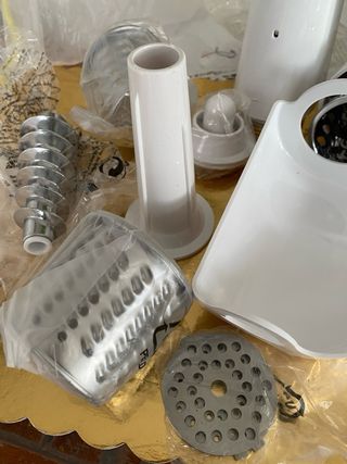 non so esattamente di quale robot da cucina facessero parte poiche’ io li compro, non li uso e quindi per fare spazio li rivendo. presumo siano del robot tritacarne rgv che non ho piu’. date una occhiata se per caso usate il tritacarne e li riconoscete: credo siano per fare tutto, anche per verdure, per grattuggiare il parmigiano, per fare salsicce e lavorare i pomodori. li avevo comprati successivamente ed anche questi accantonati e mai usati. sono molto costosi presi singolarmente. li vendo in blocco a 50€ oppure a singolo pezzo se ve ne interessa uno in particolare. li rivendo a meno del 50% del loro prezzo seppur nuovissimi. Approfitta dei miei bassi prezzi e di una unica spedizione per ordinare più articoli