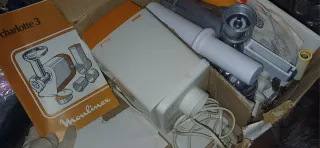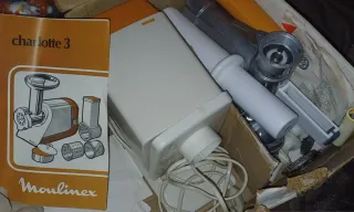 Tritacarne Moulinex modello Charlotte 3, completo di accessori. - Corpo macchina in plastica bianca. - Accessori in metallo e plastica. - Manuale di istruzioni incluso.