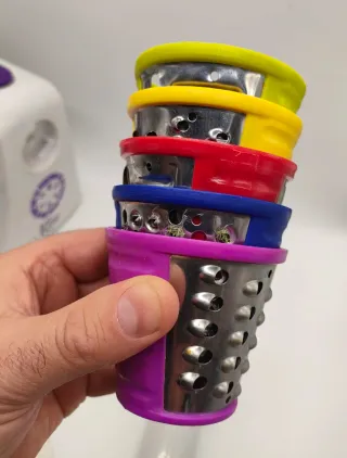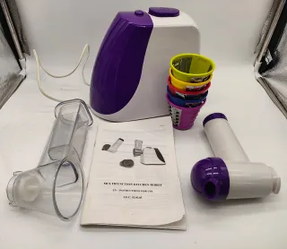 Robot da cucina multifunzione per tagliare e grattugiare. Include diversi accessori colorati e un manuale di istruzioni. - Base bianca e viola. - Set di 5 accessori impilabili (giallo, rosso, blu, viola, verde). - Accessorio trasparente per l'inserimento degli alimenti. - Accessorio per l'espulsione degli alimenti. - Manuale di istruzioni incluso.