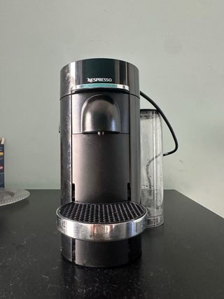 Macchina per caffè Nespresso Vertuo Plus, dal design moderno e compatto. - Colore nero. - Serbatoio dell'acqua trasparente. - Vassoio raccogligocce cromato.