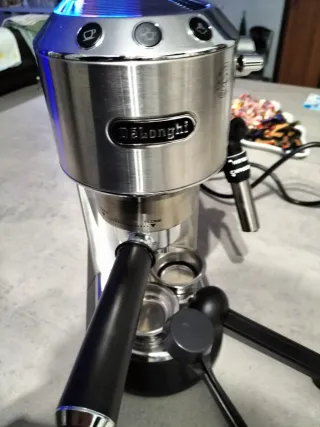 Macchina per caffè espresso DeLonghi Dedica, perfetta per preparare ottimi caffè a casa. - Design compatto in acciaio inossidabile. - Pannello comandi intuitivo con icone. - Portafiltro per caffè macinato o cialde ESE.