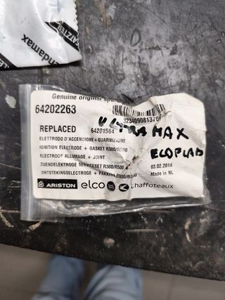 Elettrodo di accensione originale Ariston, codice 64202263, perfettamente conservato. - Adatto per cucine Ariston.ecoflam, ultramax - Include guarnizione. - Codice ricambio: 64201564