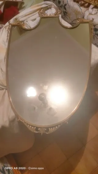 Elegante specchio con cornice dorata, risalente agli anni '50. Un pezzo d'arredo che aggiunge un tocco vintage alla tua casa. - Cornice in metallo dorato finemente lavorata. - Forma a scudo con dettagli decorativi superiori.