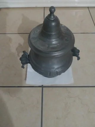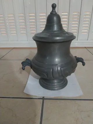 Antica biscotteria in peltro con coperchio e manici decorati. Un pezzo d'arredo dal fascino vintage. - Materiale: peltro - Design elaborato con motivi floreali - Coperchio con pomello decorativo - Due manici laterali