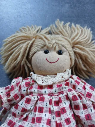 Questa adorabile bambola di pezza . DOLL - Tessuto morbido e sicuro per i bambini. - Vestitino a quadri rossi e bianchi. - Dettagli ricamati sul viso. - Capelli biondi raccolti in due codini.