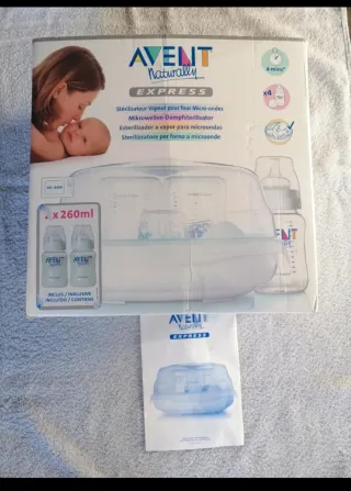 Sterilizzatore Avent per microonde ,a vapore, pronto solo in 2 minuti,elimina il 99% dei batteri, ideale per biberon,tiralatte,succhietti,posate,ecc... Sterilizza fino a 4 biberon contemporaneamente. Tra i 1200 e 1800 w al ciclo sterilizza il tutto un solo 2 minuti.