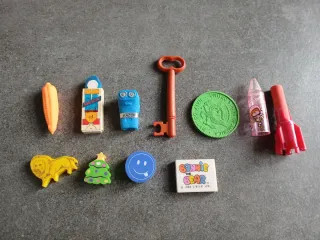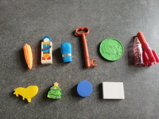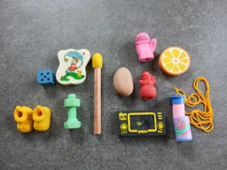 Gomme di varie forme , alcune sono del Mulino Bianco - Gomma a forma di secchiello verde. - Gomma a forma di dado rosa con puntini neri. - Gomma a forma di moneta dorata. - Gomma a forma di ciliegie rosse. - Gomma a forma di cuore - Gomma a forma di orsetto bianco e rosa. - Gomma a forma di pattino da ghiaccio giallo. - Gomma a forma di stella arcobaleno. - Gomma JOY con arcobaleno. - Gomma Easter con coniglietti viola e rosa. La foto in cui c'è una gomma singola e in regalo.