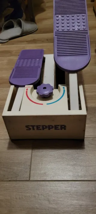 Stepper per allenamento fitness con pedali viola. - Struttura in metallo bianco. - Manopola di regolazione della resistenza con indicatori colorati.