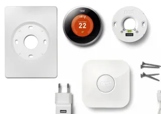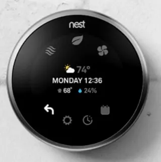 Termostato intelligente Nest, dal design moderno e circolare. - Cornice in metallo spazzolato. - Display touch screen a colori. - Indicatore di temperatura e umidità.