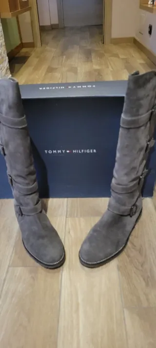 Eleganti stivali alti in pelle scamosciata. Tommy Hilfiger, taglia 40, lunghezza soletta 24 cm, altezza 40 cm, altezza suola 1 cm, altezza tacco 2 cm, larghezza nella parte superiore 18 cm, larghezza al rialzo 14 cm.